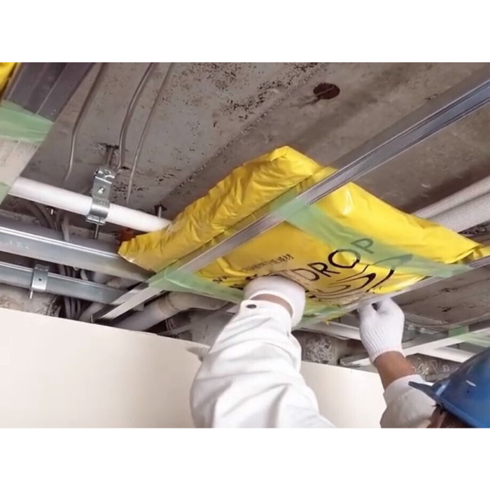 下の階の天井ボードにのせる遮音材です。袋の中には特殊粒材が入っています。1袋のサイズは450mm×450mmです。1袋の重量は4kgです。1あたり1.5~2個設置します。