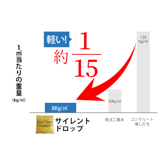 二重天井(せっこうボードの二重貼り)と同程度の+6.6kg/にも関わらず、遮音効果(重量床衝撃音の低減度)は約5倍です。