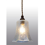 ガラスシェードは、吹きガラス工法または型押しガラス工法で作成されています。ガラスシェード内に気泡が残ることがあったり、形の若干のゆがみや、中心線のずれなどが起きることがあります。また、エッチング技法を使ったガラスシェードは手作業のため、模様にわずかな曲がり等が起きることがあります。