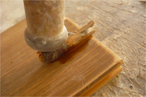 「節抜け」は、こういった木材の端の部分でよく発生します。