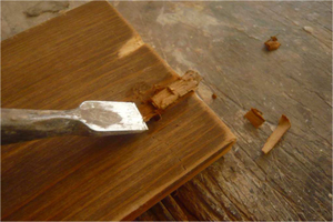鋸で大まかにカットしたら、次はノミでペーパーができるくらいまで削ってください。