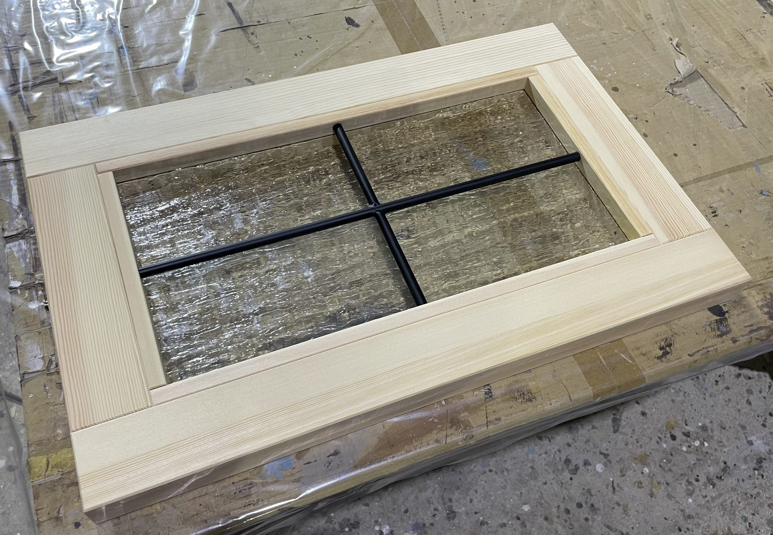 - インテリアウィンドウ 片面アイアン格子 縦軸回転窓 パイン材 無塗装