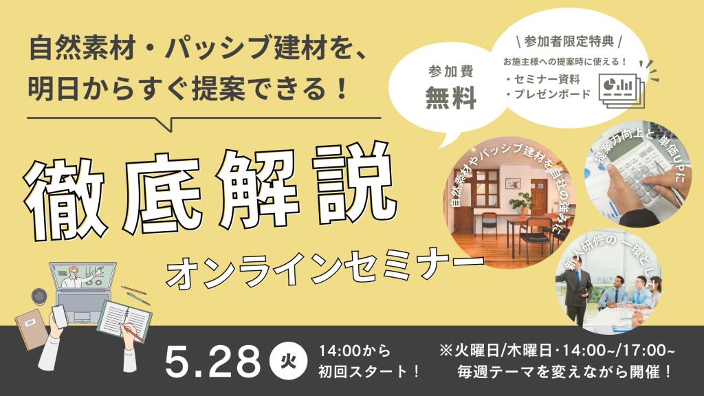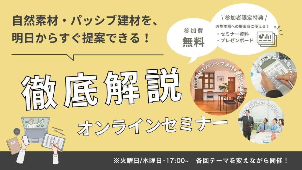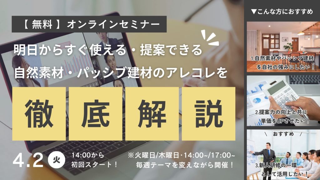 - \ 4月2日(火)より開催 / ◆無料オンラインセミナー◆ 明日からすぐ使える・提案できる!自然素材・パッシブ建材のアレコレを徹底解説!