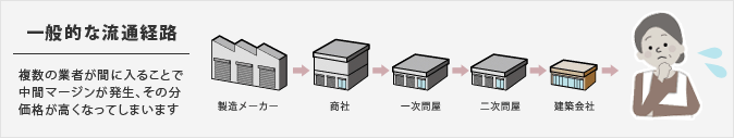 一般的な流通経路とは・・・お客さまが購入するまでに複数の業者が絡むことで都度中間マージンが発生するため、価格が高くなってしまいます。