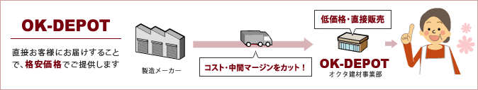 OK-DEPOTは製造メーカーと直接やり取りをすることで、大幅な中間マージンを徹底的にカットするため、お求めやすい商品価格でのご提供が可能になります。
