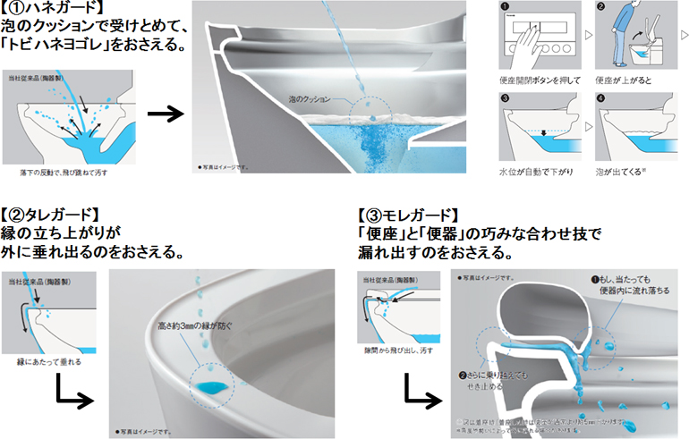 「ハネガード」では、従来のアラウーノで便器内の自動洗浄に使用していた激落ちバブルを、小便のハネの抑制にも活用。便座をあげると自動で水位が下がり、泡を投入することで、主に男性が立ちながら用を足した時のハネを抑えてくれます。さらに、「タレガード」で便器の周囲に3mmの縁の立ち上がりを設け、便器周囲へのタレも抑制。「モレガード」では、便座裏に突起をつけることで座り小便時の小便漏れにも配慮しました。この三つのこだわりでトイレ空間の悩み事の原因となる汚れを防いでくれるのです!