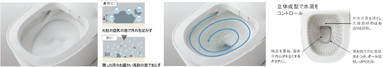 流すたびに、2種類の「泡」と少ない水で一気に流しきる「新スパイラル水流」でしっかり自動洗浄します。