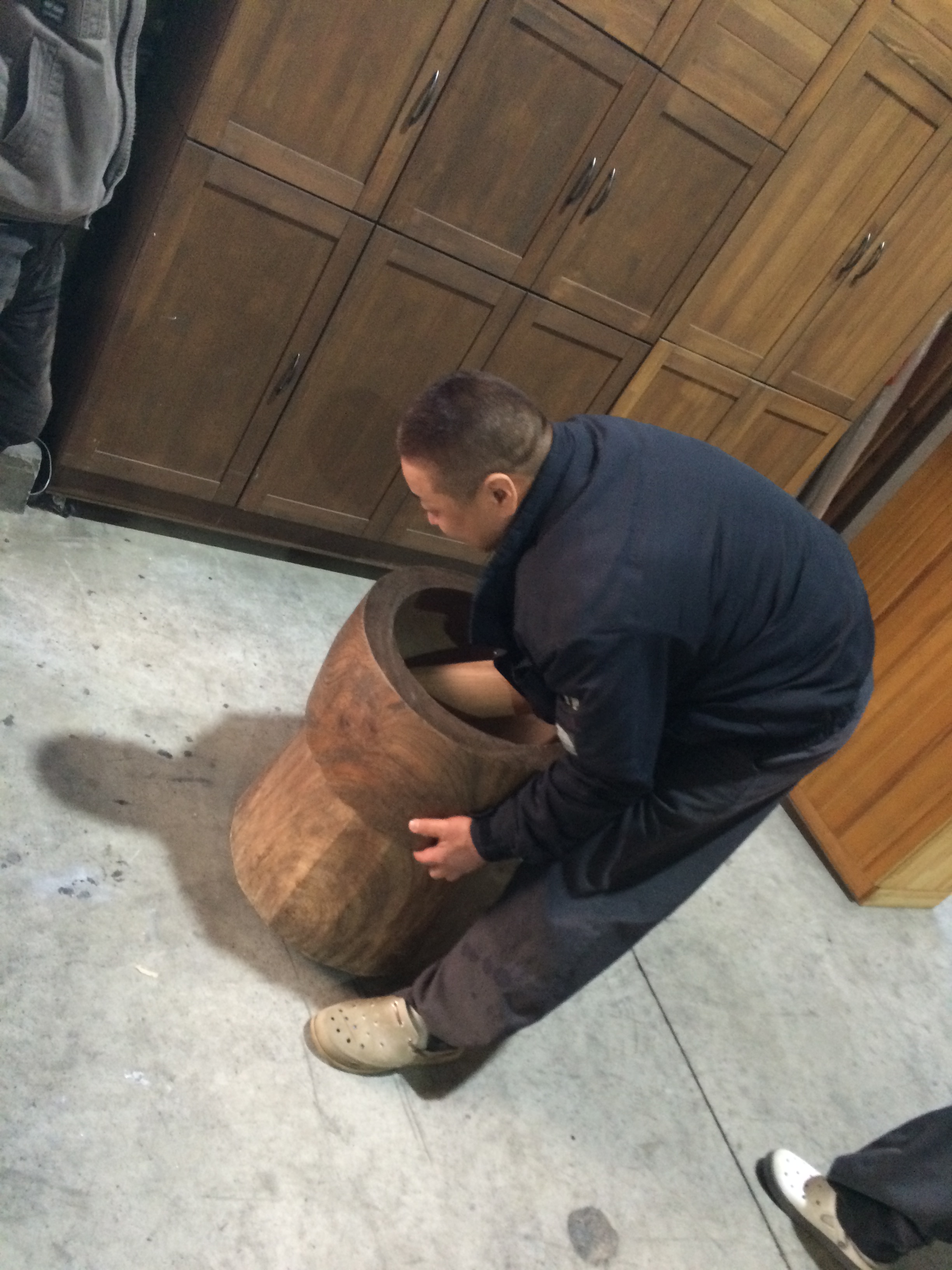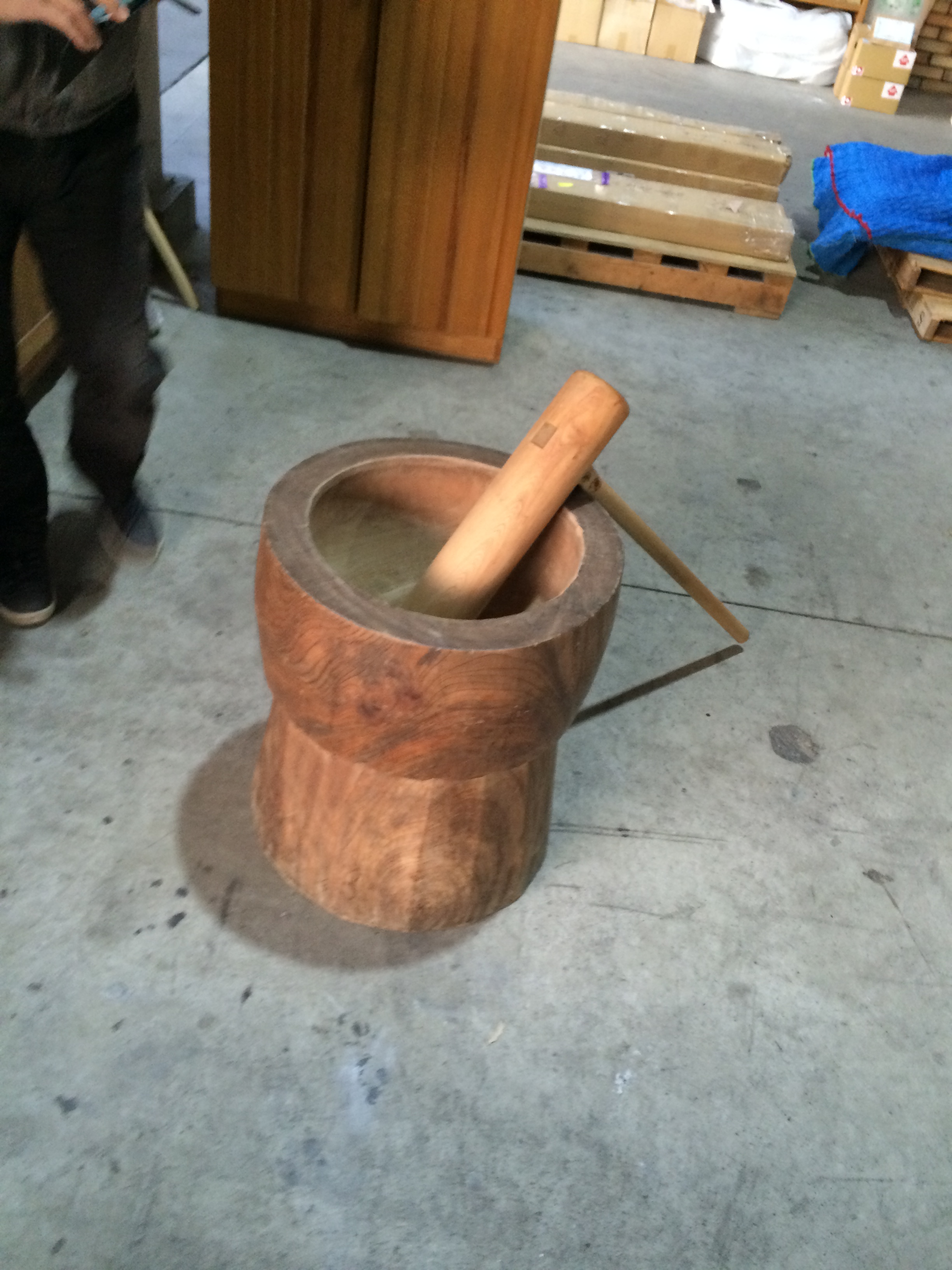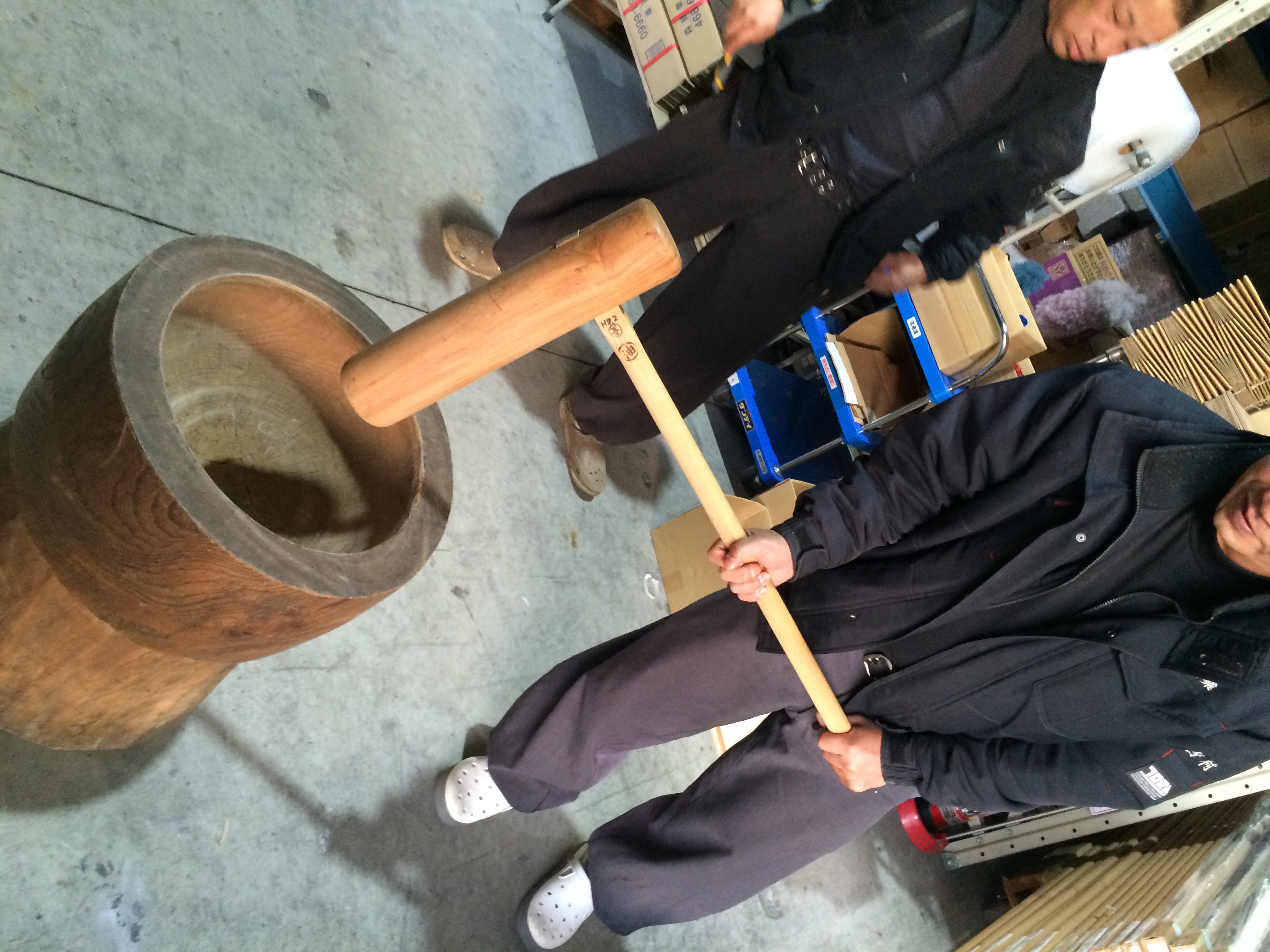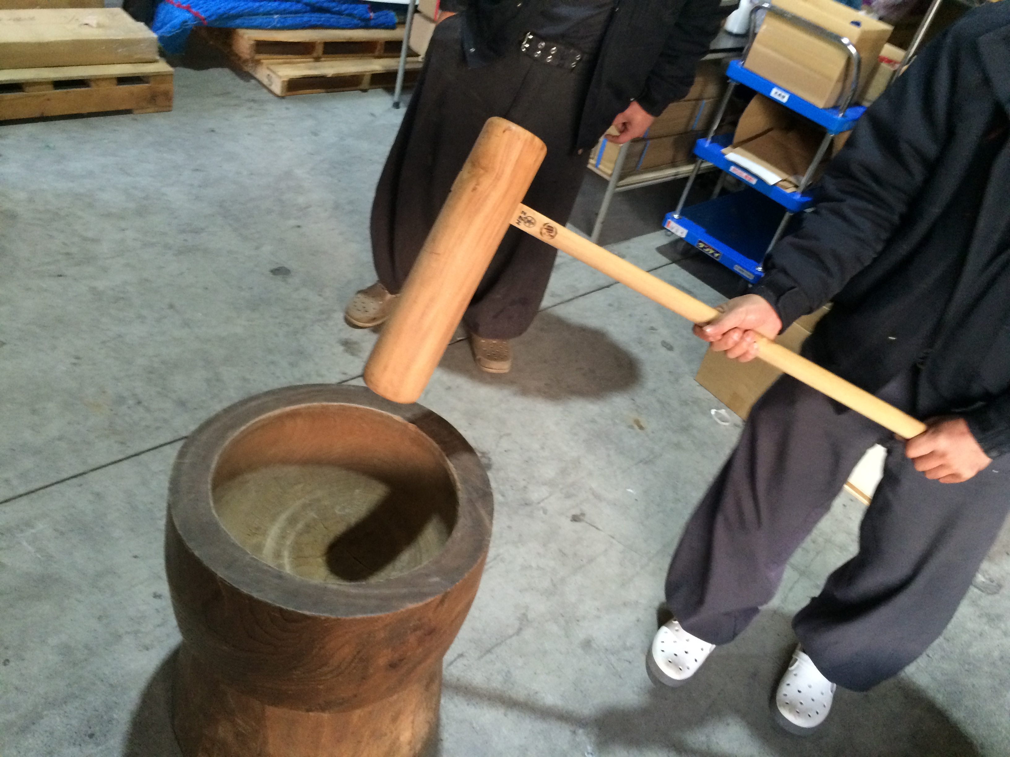 餅を作るため、今日は赤ヒノキの臼、ケヤキの杵を物流センターに搬入しました。