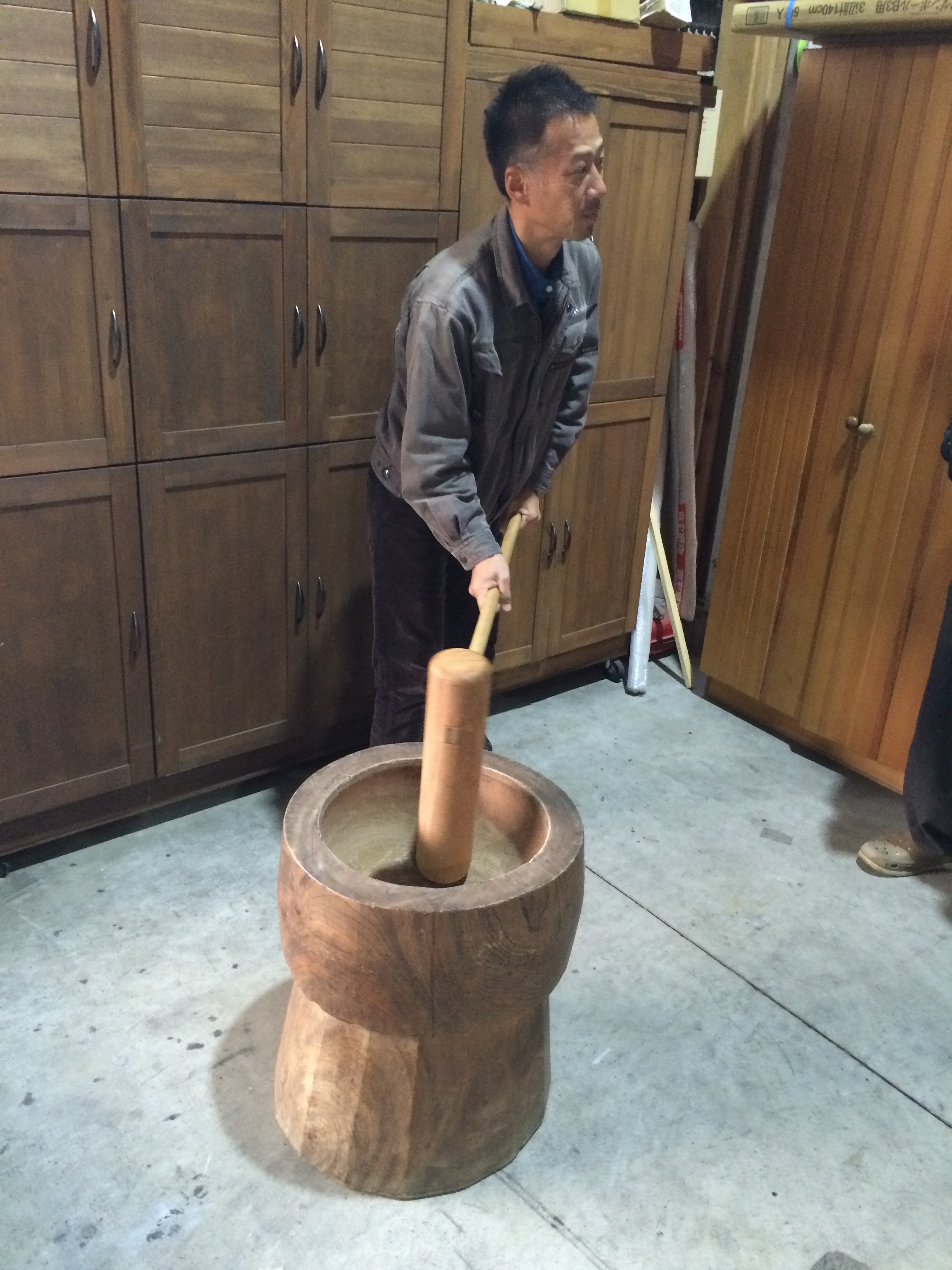 OK-CRAFTSの奥原社長が伝統の餅作り方法を語りながら、杵撃ちを見せて頂きました。