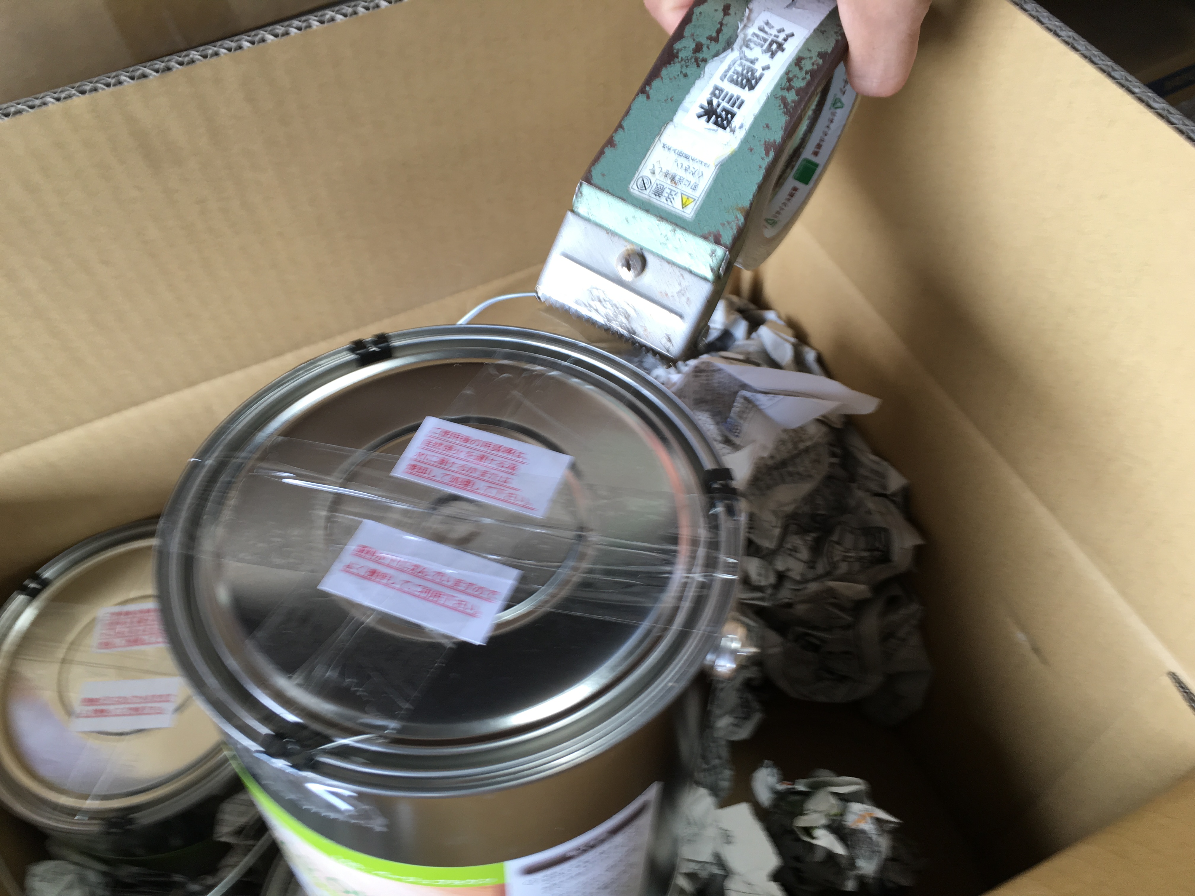 それでも海外郵送の場合は、テープで蓋を「十字」に貼ります。塗料外梱ケースが上下逆さまに扱われたり、強い衝撃や激しい揺れなどに対して、この簡単な措置で塗料漏れの事態から救われるかもしれません。