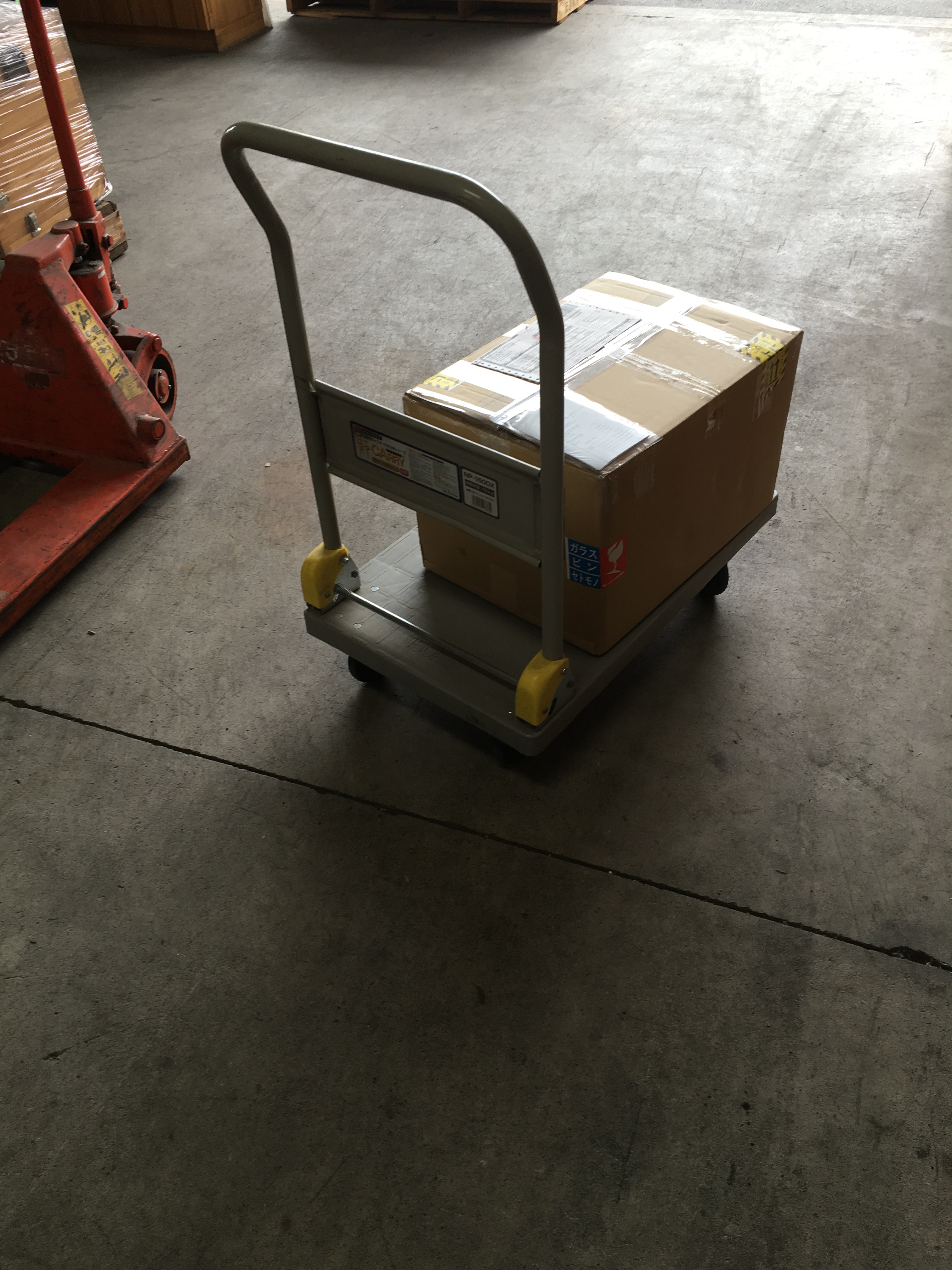 梱包箱の上に取り扱い注意、天地無用シールを貼りました。