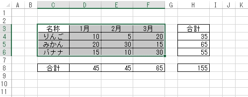 「C3」から「F6」のいずれかのセルが選択されている状態で、[Ctrl]+[A]を押すと「C3」から「F6」のアクティブなセル(データが入力されている)範囲が選択されます。