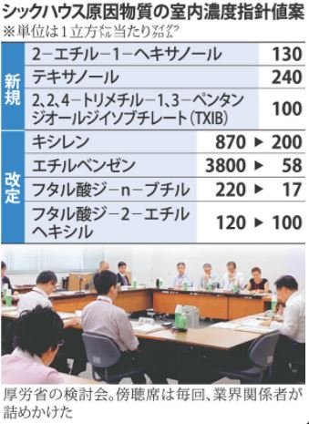 厚労省が2003年7月に施行されたシックハウス対策法案で選定した特定13物質に加え、新たに3つの化学物質を加え新たに室内濃度の指針値を定める方針を固めた。