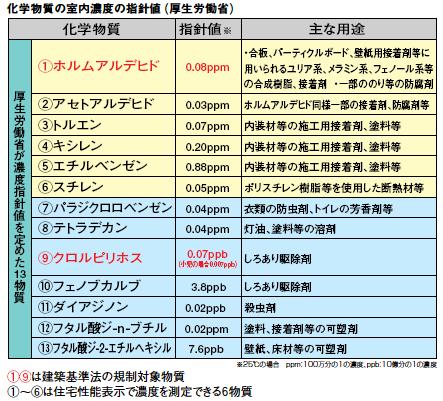 指針値は、それ自体に法的強制力はなく、規制されている化学物質は①ホルムアルデヒドの内装使用制限と、⑨クロルピリホスの使用禁止にとどまり、他11の化学物質は建築業界の自主規制に委ねられている。