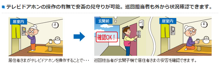 居住者は定期的に室内の確認ボタンを押し、巡回担当者が外の子機から確認する仕組みです。