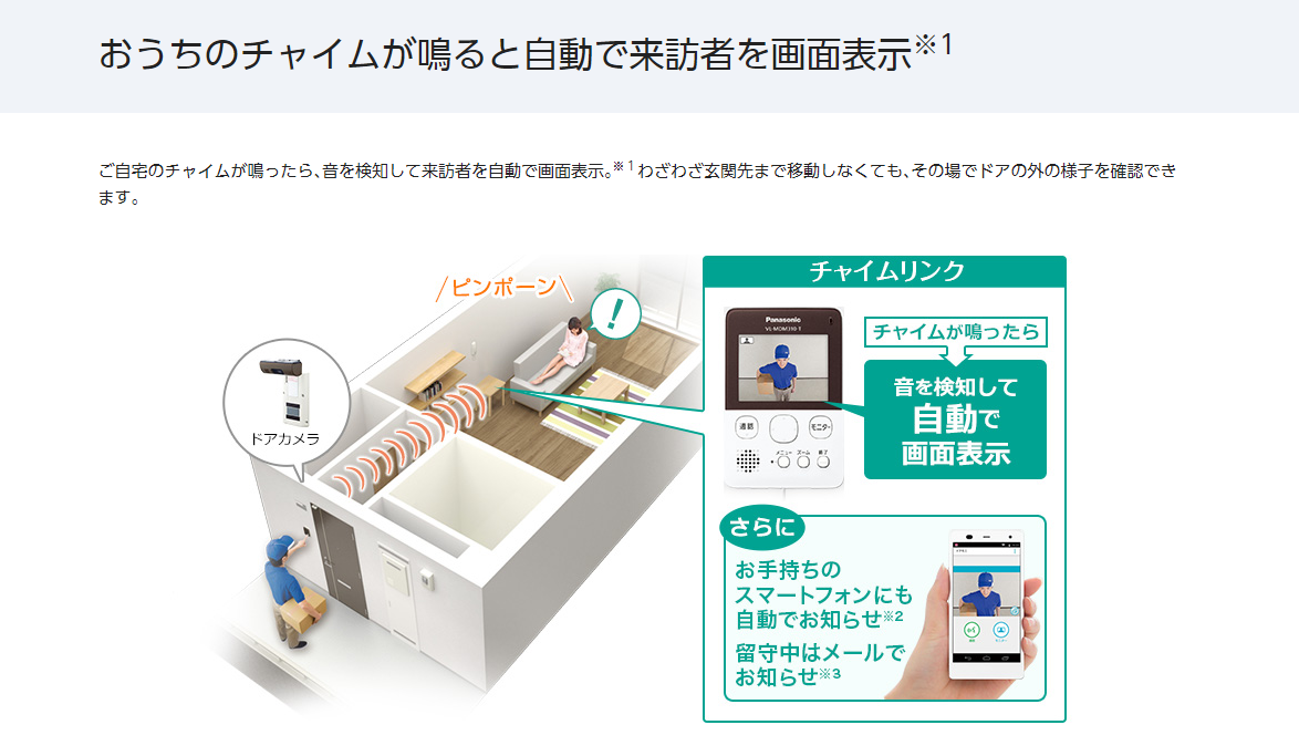 チャイムが鳴ると自動で来訪者を親機に画面表示しますので玄関先まで移動しなくても、