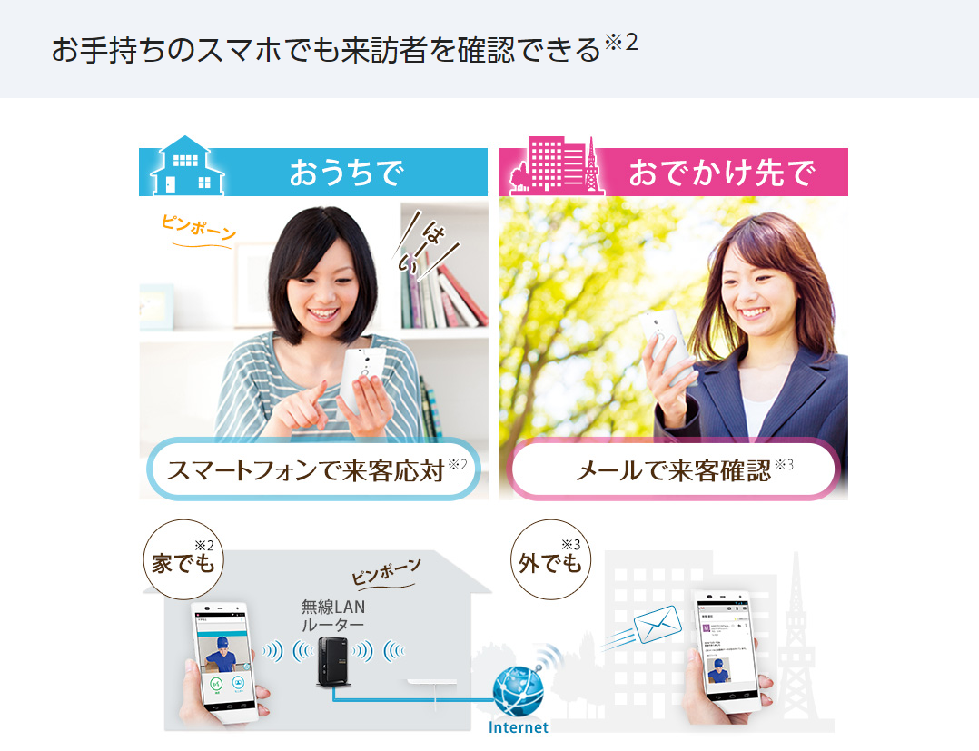 さらに、お手持ちのスマートフォンで来客対応が出来たり、メールとの連動、