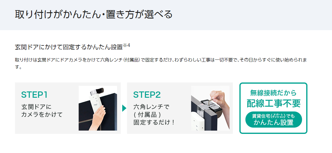 取付方法は簡単で、既存のドアに金具を挟み固定するだけなので配線工事は不要です。
