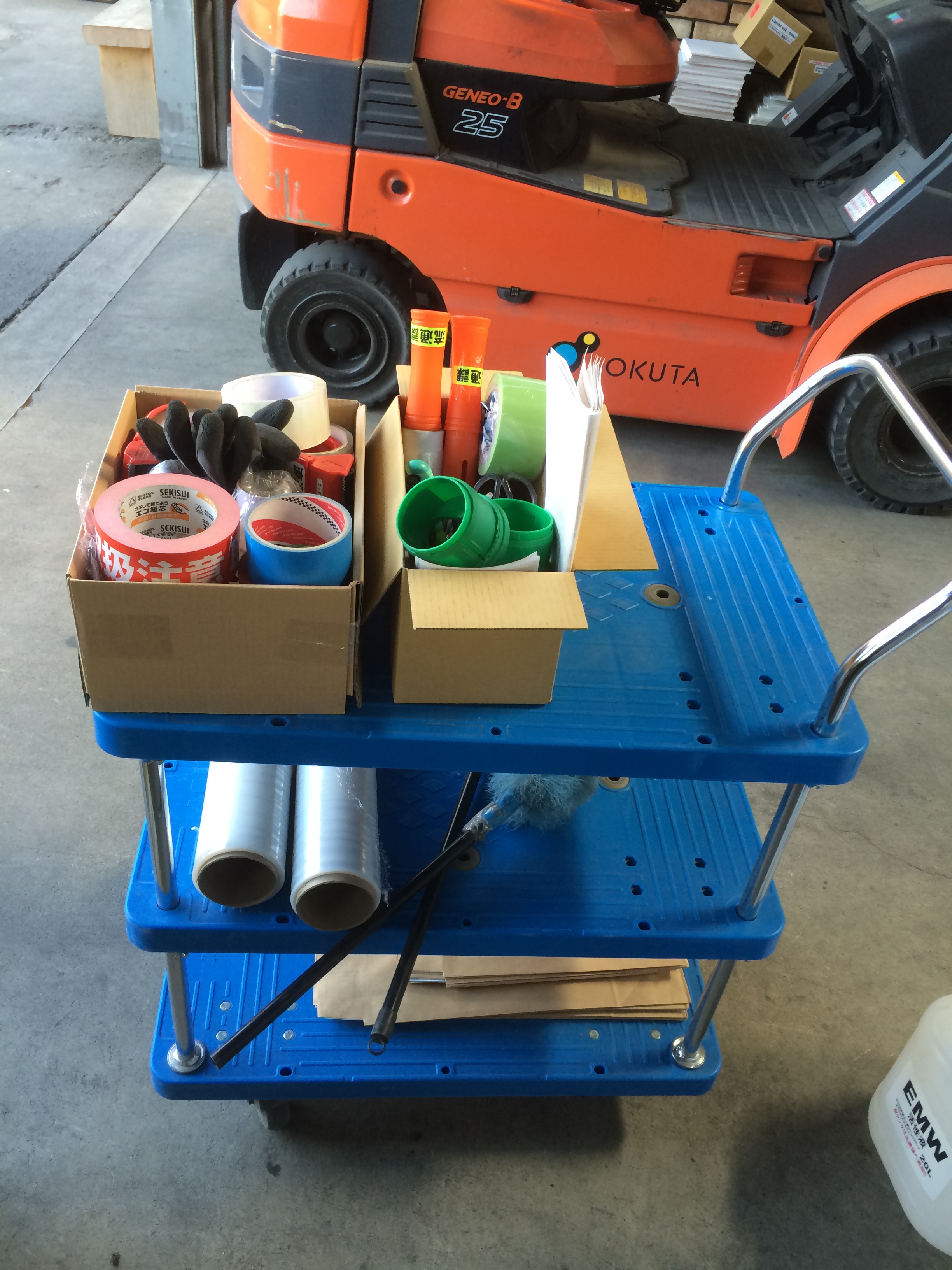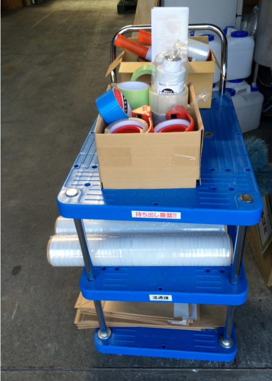 以前は梱包材などを取る度に行ったり来たりしていました。いまは常用なものは台車から取ることができるのでその手間が節約になります。