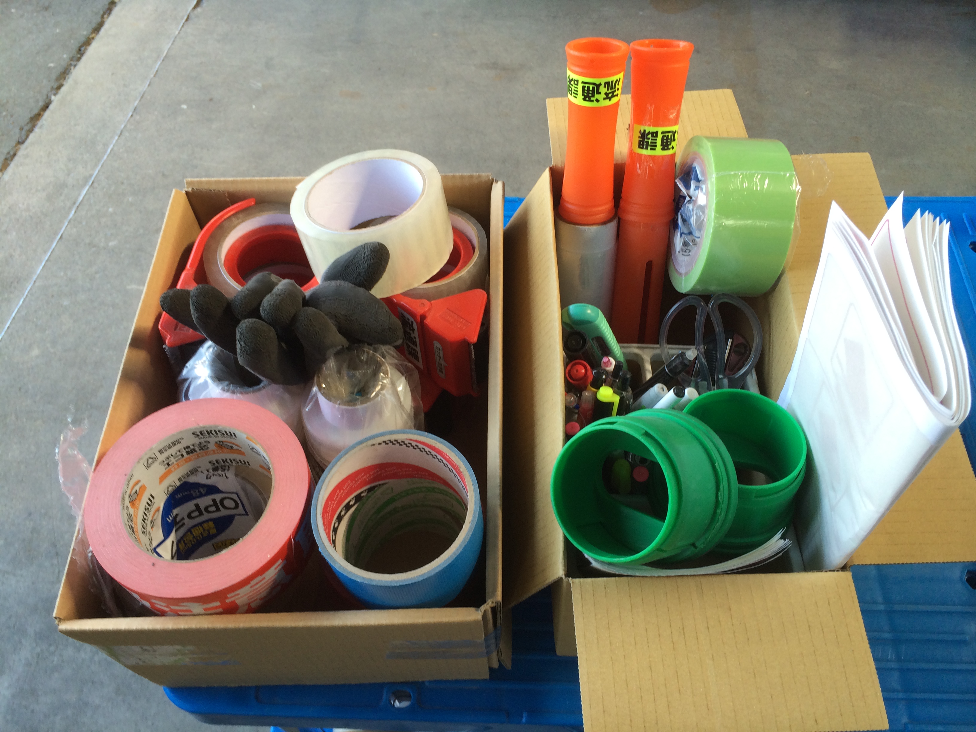 毎日出荷する前の準備として各種類テープ、軍手、ハンドラップ、カッター、マジックペン、シールなどの常用な梱包材、小物用具を台面に取り揃えます。