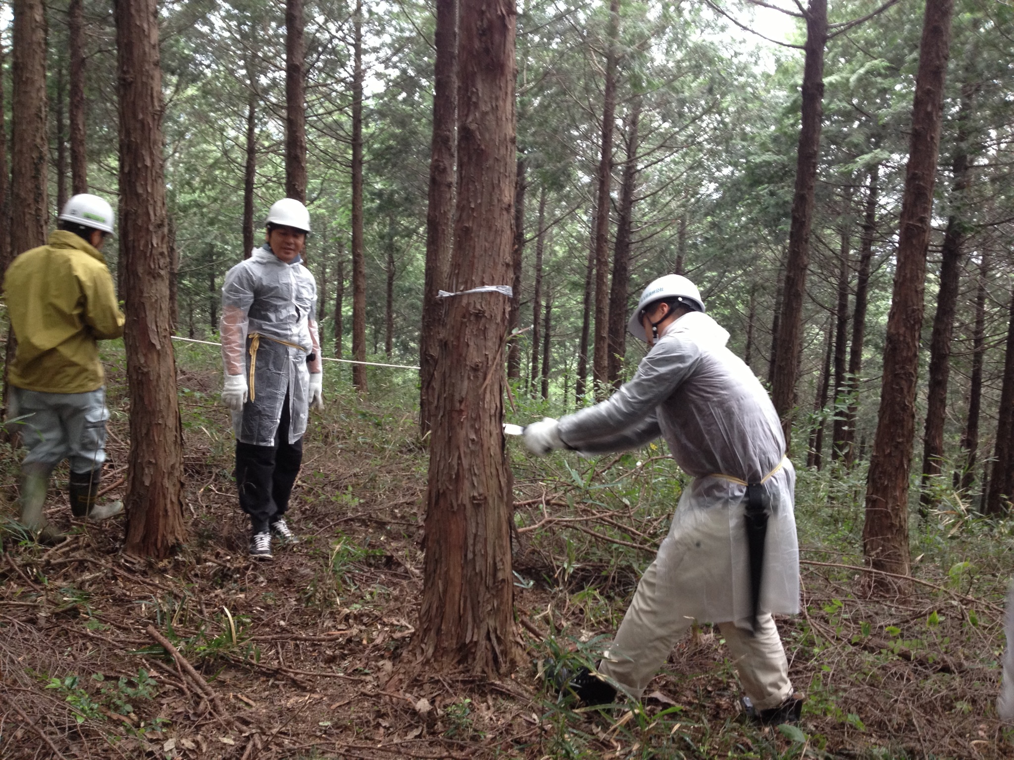 今回体験させて頂いた間伐とは、植栽木の成長によって混み過ぎた状態になった森林を適度に間引いて、残した植栽木が健全に育成できる空間を作る為の作業です。