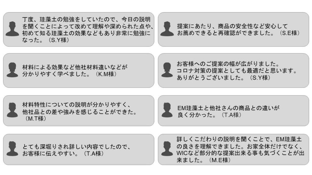 ◆お客様の声(2020年7月・2021年6月開催のEM珪藻土・EM漆喰セミナーアンケートより)