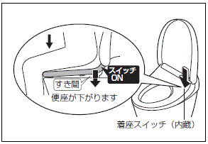 便座の片側を沈み込ませて、ウォシュレットのスイッチをONにします。