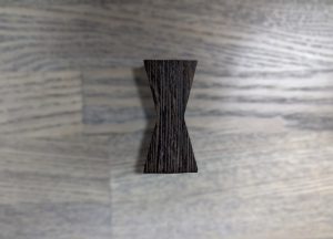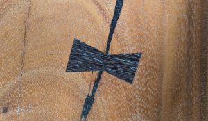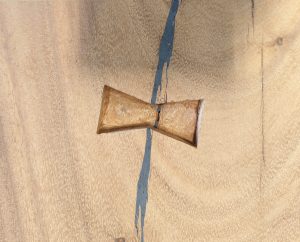 簡単言うと、割れているところや、接ぎ合わせている部分に蝶ネクタイ(逆向きの台形をつないだもの)のような形の木片を埋め込む技法で、その木片を埋めることによって、割れをこれ以上広がらなくする効果や、接ぎ合わせを強固にする効果が期待できます。下の画像が一般的な形のものです。