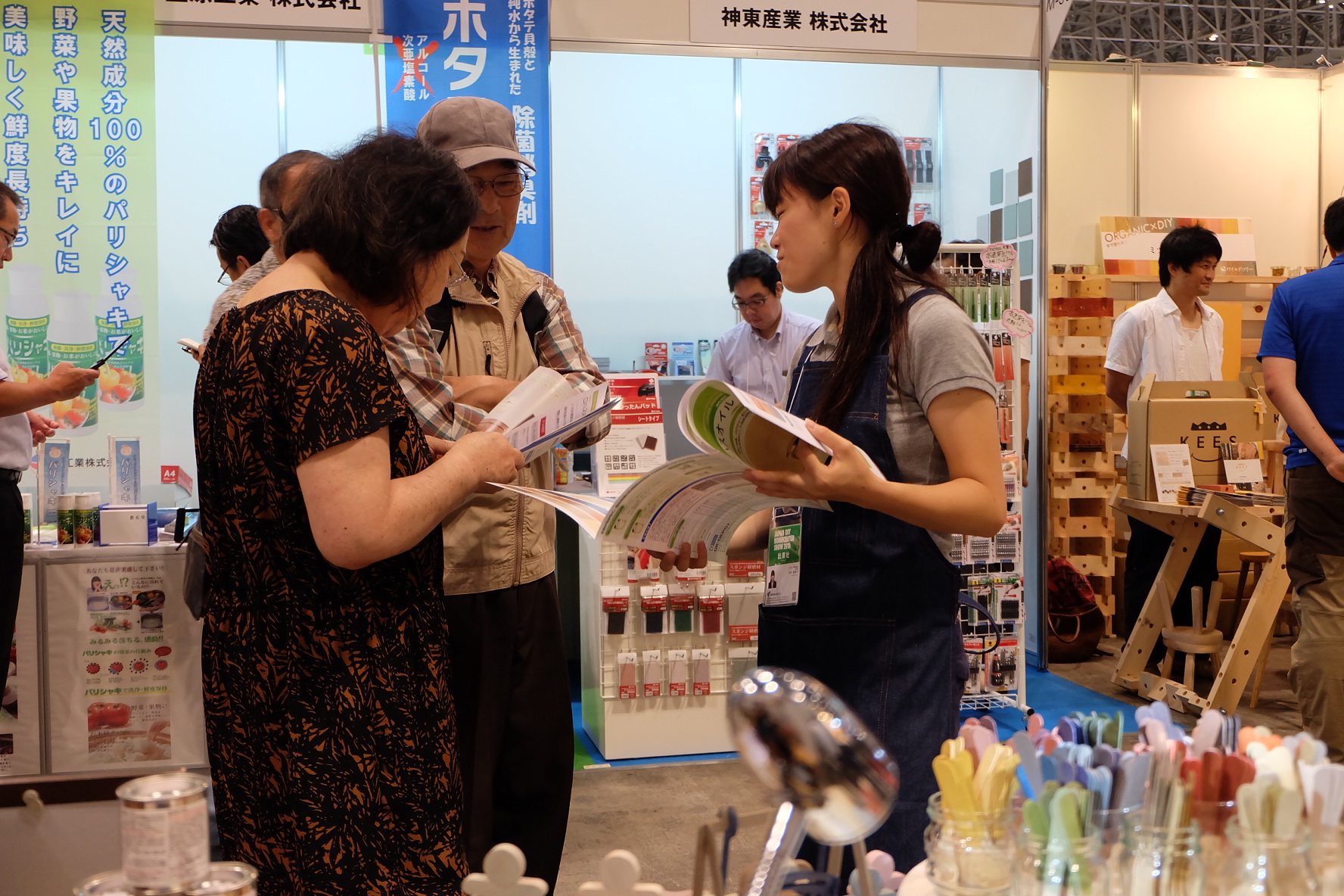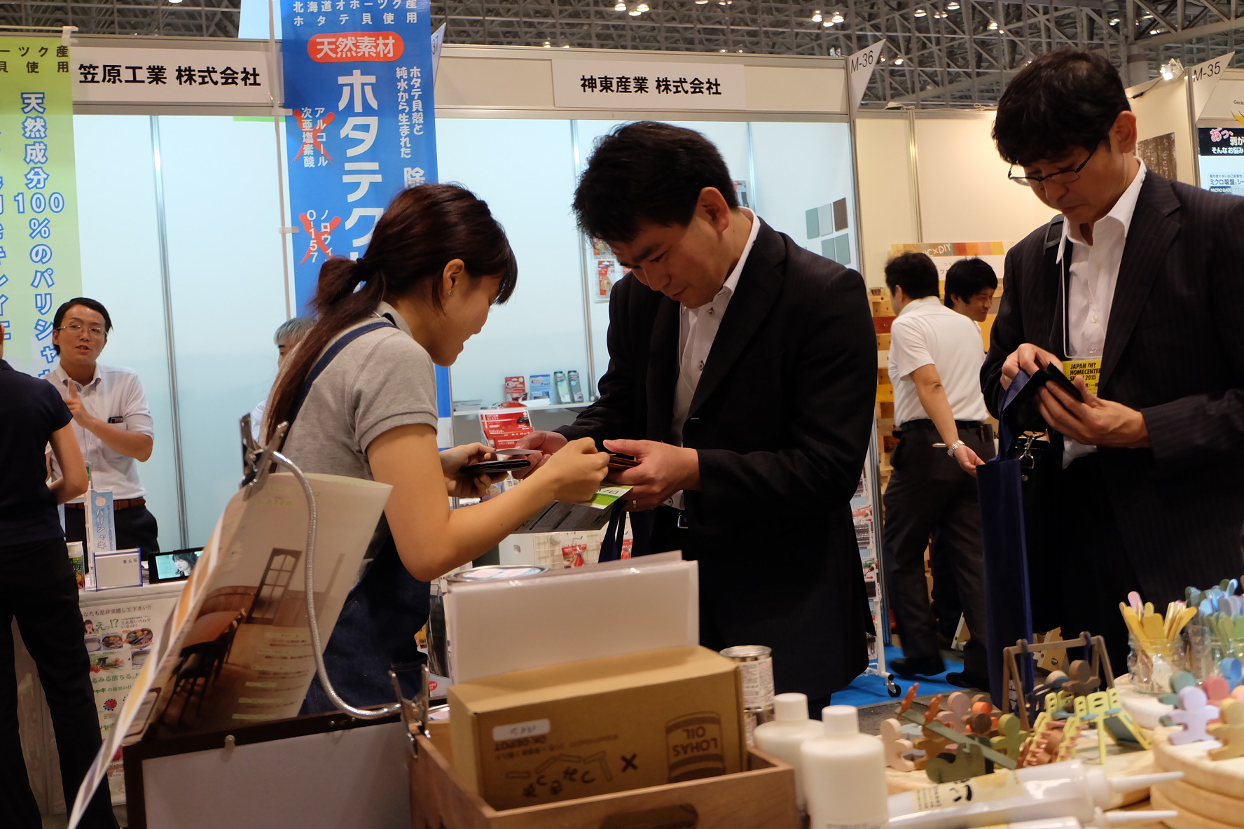 ?ブースにお立ち寄り頂いたお客様に商品説明やご挨拶を行います。