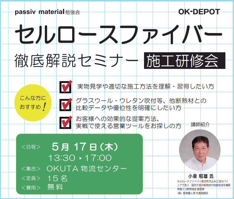 OK-DEPOTでは5月17日(木)にセルロースファイバーの勉強会を開催いたします!