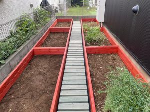 ガーデンアプローチを設置し、防草シートで雑草対策をし、