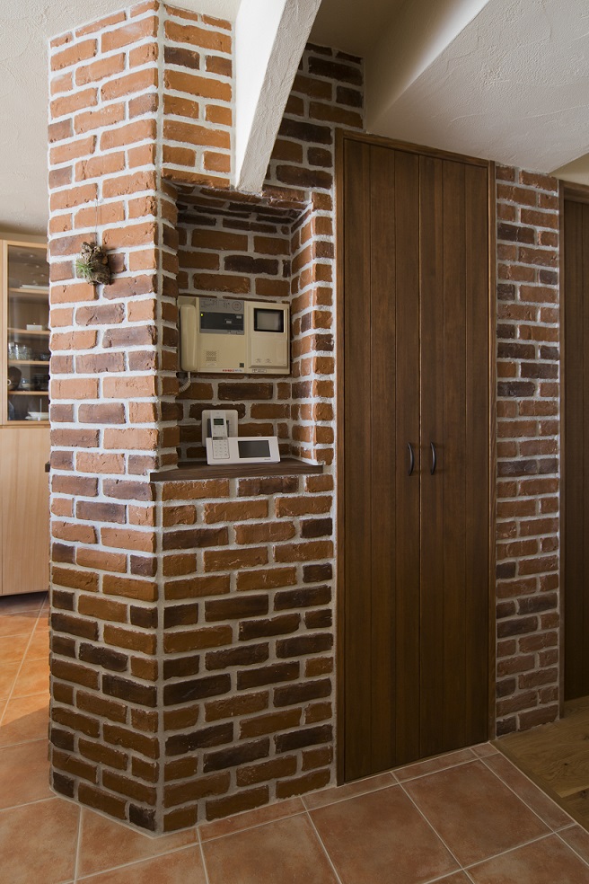 リビングを見渡せるキッチンの背面をレンガ張りにされており、