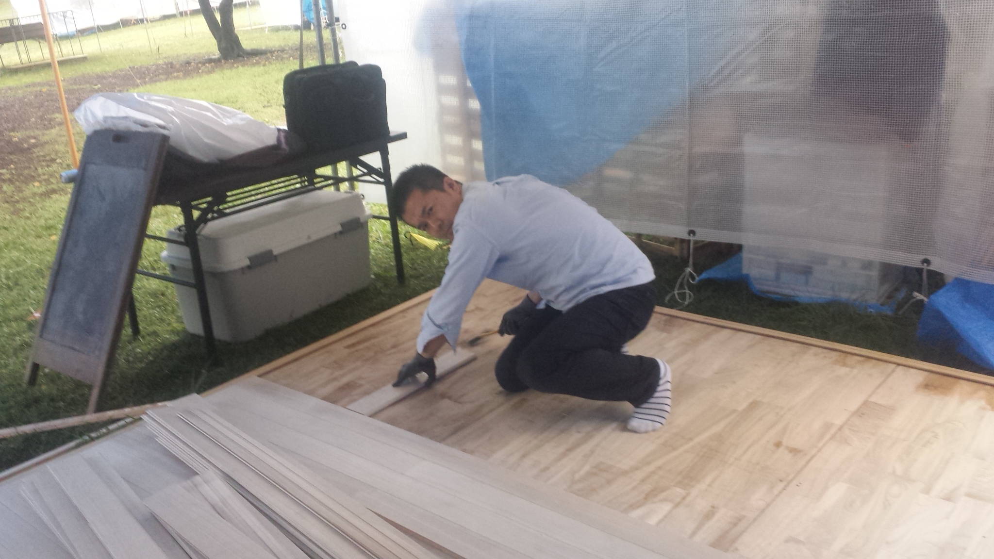 設営時は雨模様でしたが、当日は晴れたらいいな~!