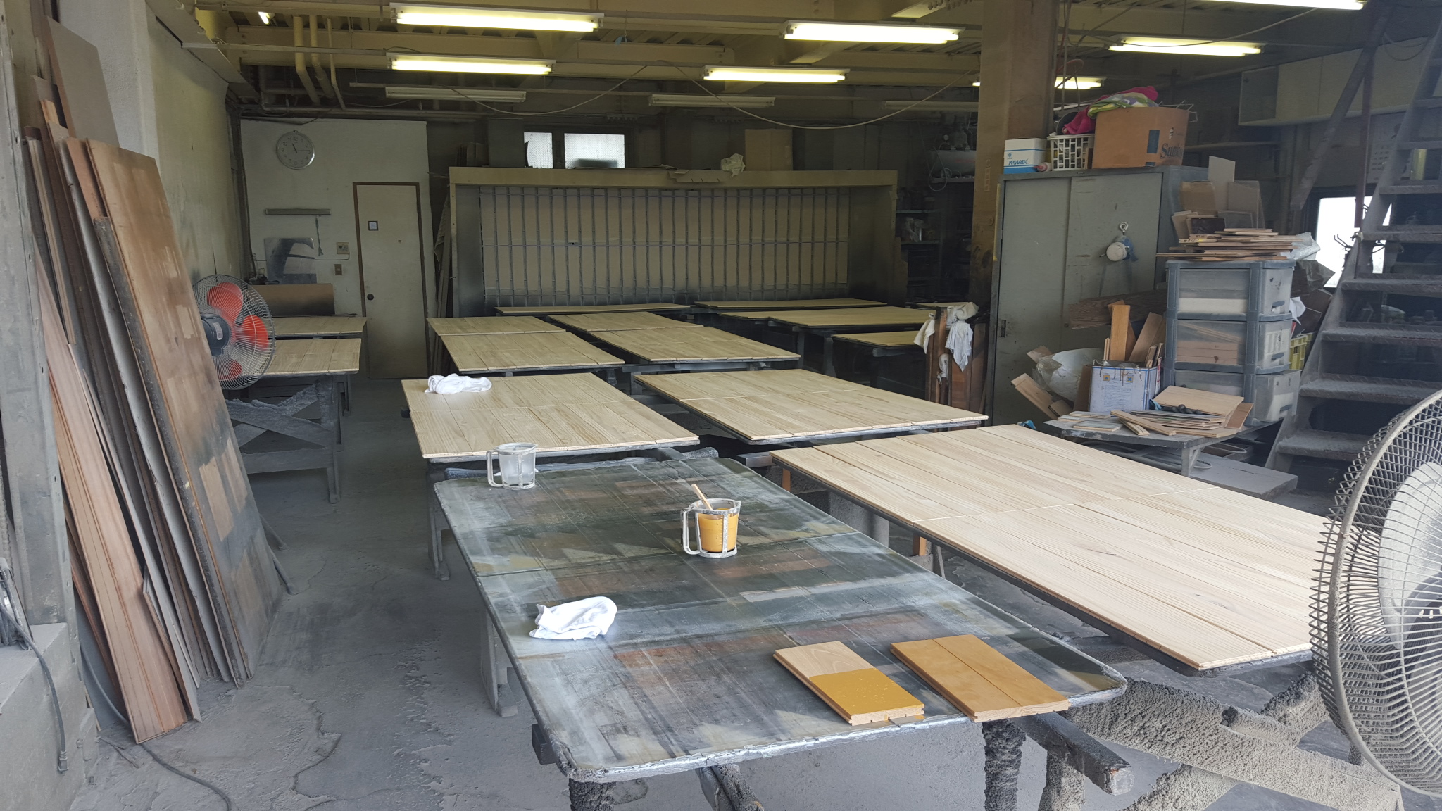 フロアー専門の塗装工場で、1ケース(半坪分)を写真の様に広げ塗装していきます。