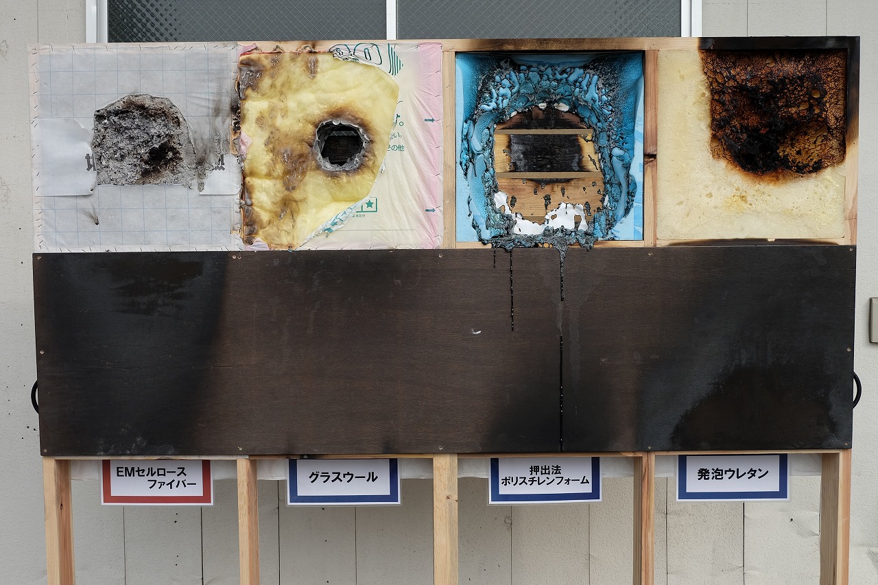 実際に試験体を同条件で燃焼させ、どの程度ファイヤーストップ効果があるかご覧いただきました。 見ての通りその差は歴然ですね!
