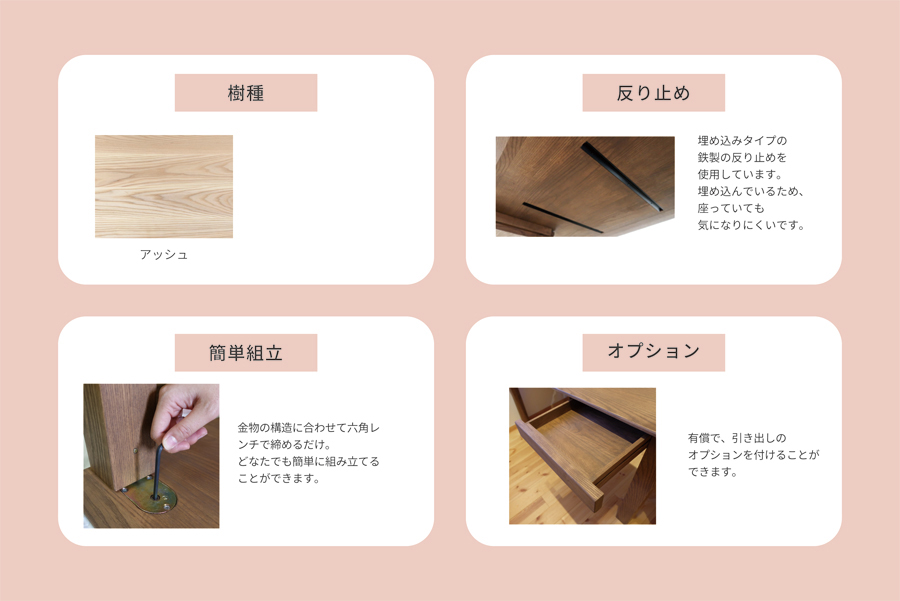 無垢材の特性上、木目や色合いにバラつきがあります。