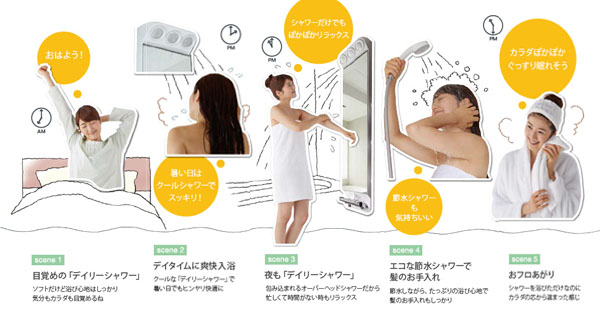 「デイリーシャワープラン」は、ワイドに広がる極細なオーバーヘッドシャワーが特徴。カラダ全身が包み込まれ、肌あたりがやさしく、癒され感があります。ゆっくり入浴する時間がない時も、シャワーを浴びるだけでリラックス感が得られます。