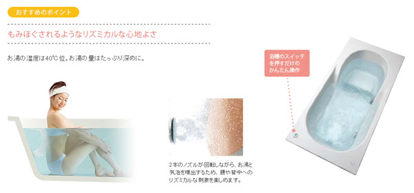 お湯と気泡の噴出を腰や背中にあて、リズミカルで心地よい刺激を楽しめます。カラダの広い範囲に噴流が当たるため、かゆくなりにくく、ジェットバスが苦手な方にもおすすめ。1日の疲れをやさしくもみほぐしてくれます。