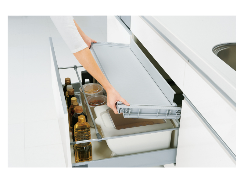 ベースキャビネットには一般的によく使用する鍋やフライパン、調味料、調理小物等はもちろん