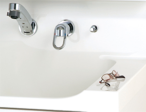 壁出しの水栓の根元は、水も汚れもたまりにくく、衛生的でお掃除もラクラク。