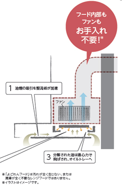 オイルスマッシャー機構が油の侵入をしっかりガードする「よごれんフード」は