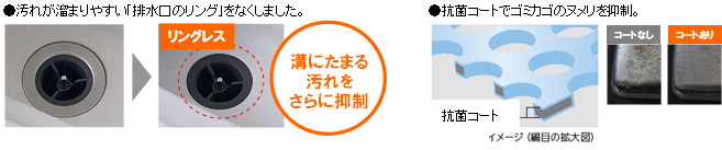 汚れが溜まりやすい排水溝のリングをなくし、ごみカゴは抗菌コート仕様で