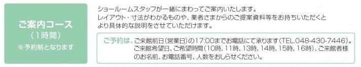 事前の予約が必要ですが、ショールームスタッフが一緒に回って、案内をしてくれるご案内コースもあります。