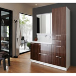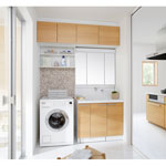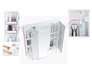 左右どちらからでも開閉できて、手元にも引き出せる便利な両開きの鏡扉。 鏡裏はすべて収納スペースで、小物からストック品までたっぷり入ります。※写真の鏡は間口900mmです。 10333-s3