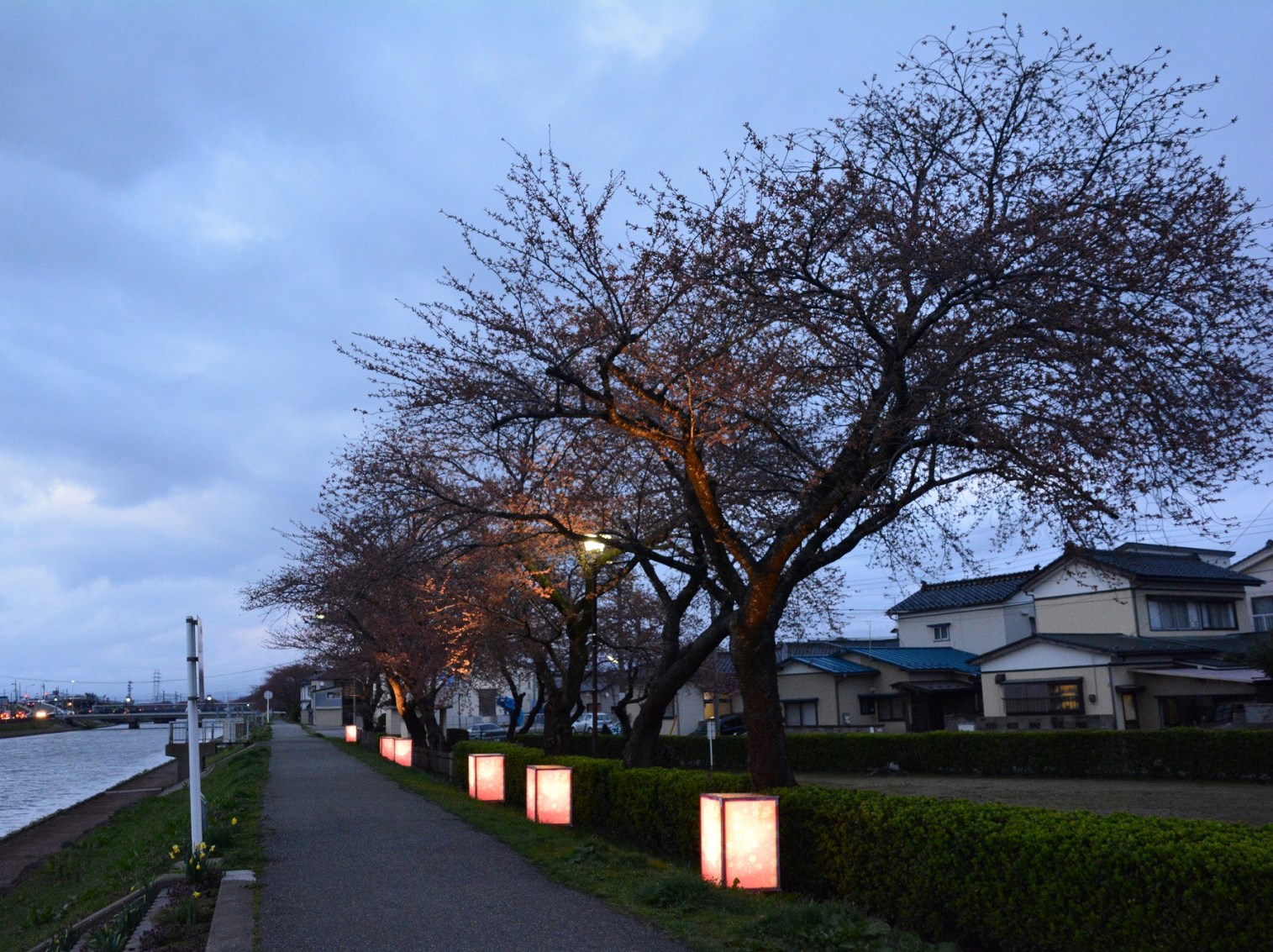 坂田市は、一帯の魅力向上による観光客、 宿泊者の拡大や滞在時間の延長、 それに伴う中心市街地の活性化を図ることを目的とした酒田テラス推進事業を行い、その一環で、新井田川桜をライトアップすることで、 ライトアップの観光面での活用や可能性についての検証を行っています。