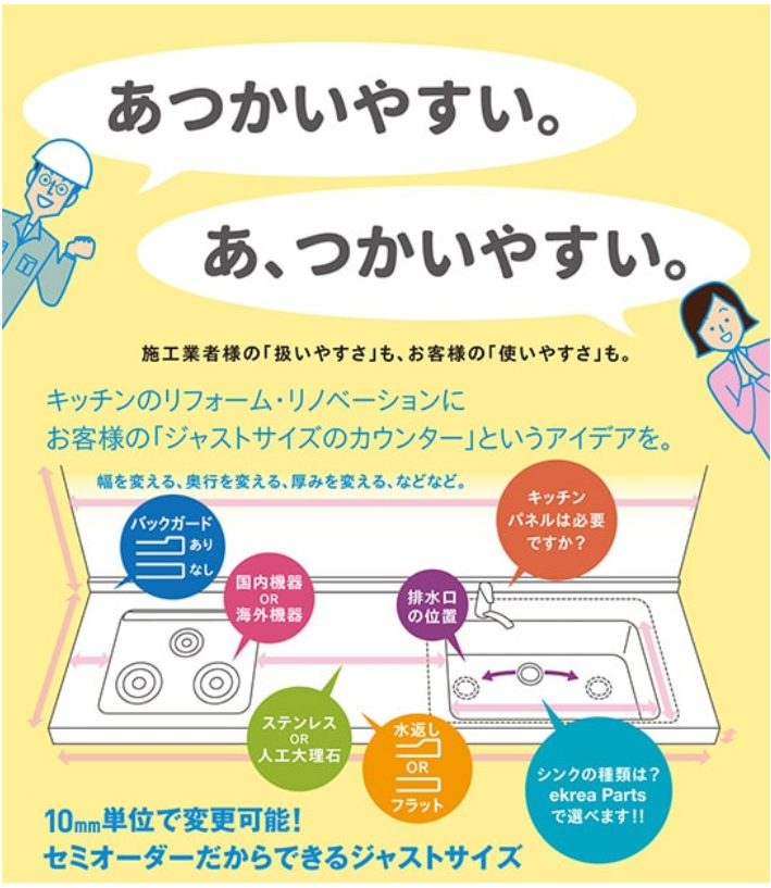 また、幅・奥行・厚みの変更が10mm単位で行えるので、キッチンリフォームでは