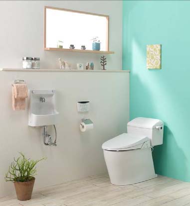 従来タンク式トイレの利点である「いざというときハンドルで洗浄可能」「温水洗浄便座が独立、便座単体交換可能」「設置環境への対応力」を継承しています。