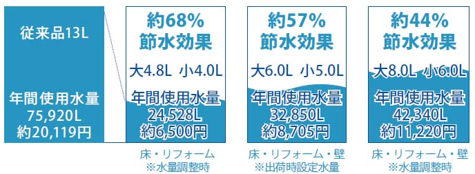 設置環境に合わせ洗浄水量を3段階に調整ができます。床下排水仕様は、調整により節水4.8L洗浄に対応します。