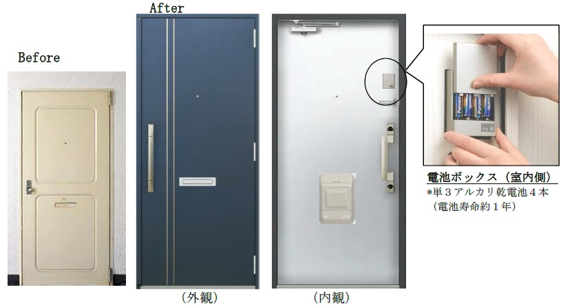 特に集合住宅の改修案件では、 大掛かりな電気工事をせずに、 玄関ドア改修とあわせて電気錠を搭載することができます。