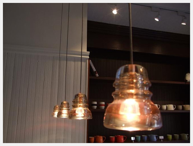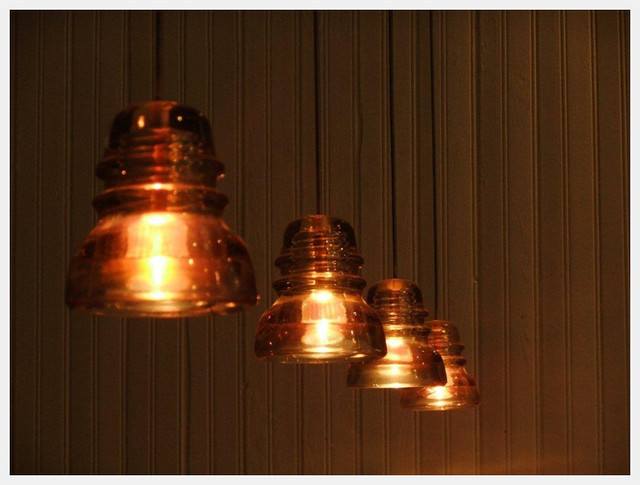 こちらの写真に使用している照明が、「碍子照明 インシュレーター」なのですが、ガラスに反射して灯っている明かりが優しく、連なって使用しているのがとてもおしゃれです。